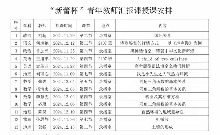 为进一步提升全校青年教师的教学能力,促进学科间的交流与合作,共同探索更高效、更创新的教学模式,助力青年教师更快更好发展,本学期,齐大附中开展了“新蕾杯”教学竞赛活动,语文、数学、英语、物理、政治、地理6大学科的13位青年教师参加了教学竞赛。
