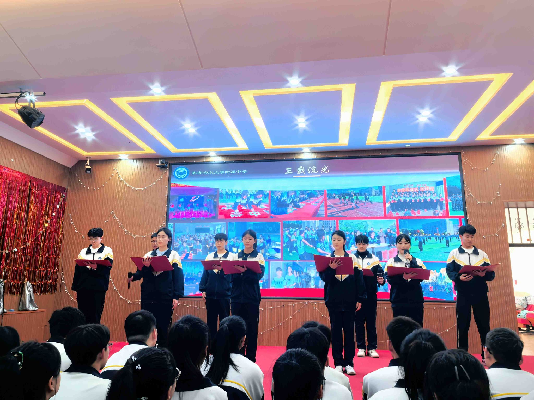 随后,全体高三教师登台,讲述三年的“同心陪伴”。老师们以教学楼的晨光、粉笔灰里的坚守为开篇,深情回忆陪伴学子走过的三年高中时光:从函数图像到诗词格律,从元素周期到洋流轨道……老师们陪学子在知识的海洋里遨游,在成长的历程中脚踏实地,收获了亲子的情义和师生相长的喜悦自豪。