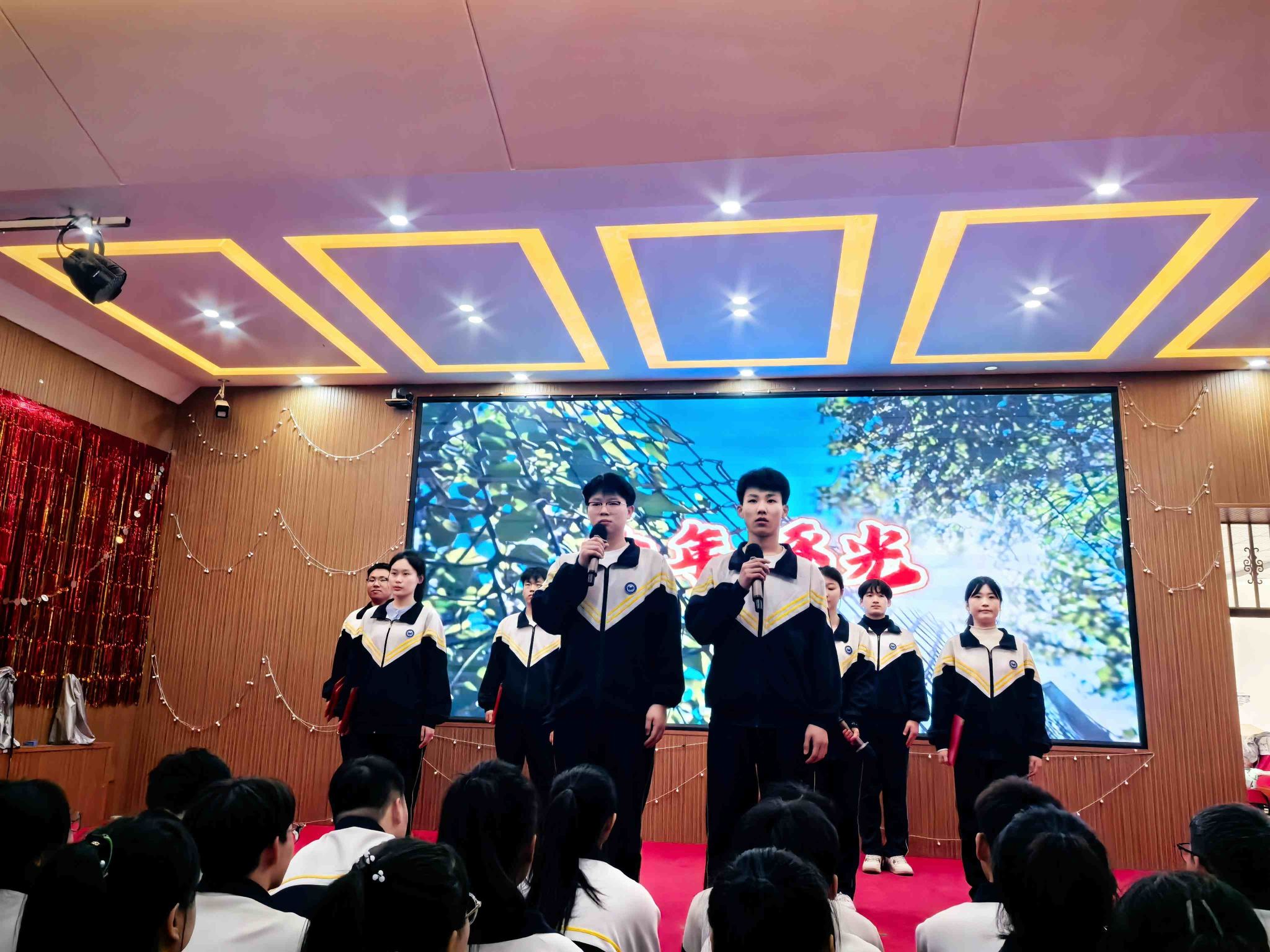 接着,第一环节“温馨感恩”在舒缓治愈的旋律中启动。高三(四)班依浩宇、刘博用深情的演唱,拨动了全场学子的心弦;饱含真情的集体朗诵至真至情:细数三年点滴,重温曾经拼搏,永记同窗苦读,感恩父母师长。一帧帧画面记脚步,学子们成长印痕在屏幕上缓缓流淌,“爸爸妈妈,谢谢你们!”一句感谢重千钧,学生们汪洋般的感恩深情感动了线上线下所有人。“铭金老师,楠姐,倩姐……谢谢你们授予我知识,教会我做人……”点对点呼唤情真意切,学生们质朴心言现场谢恩师!整个会场温情满满,无限深情,在场师生眼含热泪,心潮澎湃。